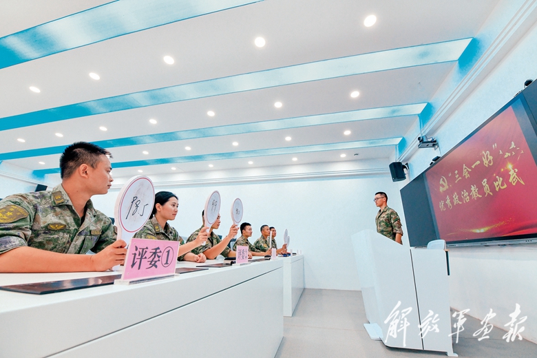 基層戰(zhàn)士代表擔任評委,為“三會一好”優(yōu)秀政治教員比武打分。