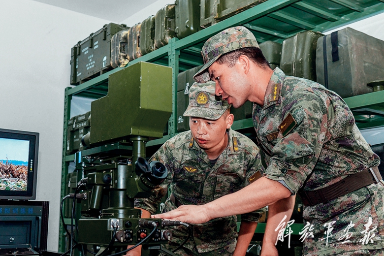 該旅某連導彈技師鐘文龍(左)與連長一同研究革新訓練模擬器。