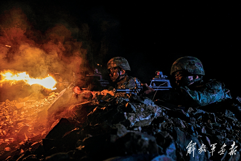 特情處置完畢,官兵調(diào)整滲透路線,通過涉水、泅渡、穿林等方式繼續(xù)向前行進(jìn)。夜色漸濃,官兵抵達(dá)預(yù)定點(diǎn)位后,迅速進(jìn)入戰(zhàn)斗狀態(tài)。在指揮員的指揮下,各小組密切配合,直插“敵陣”,摧毀其指揮中樞。