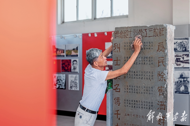 張明海認(rèn)真擦拭“解放三江營烈士紀(jì)念碑”。