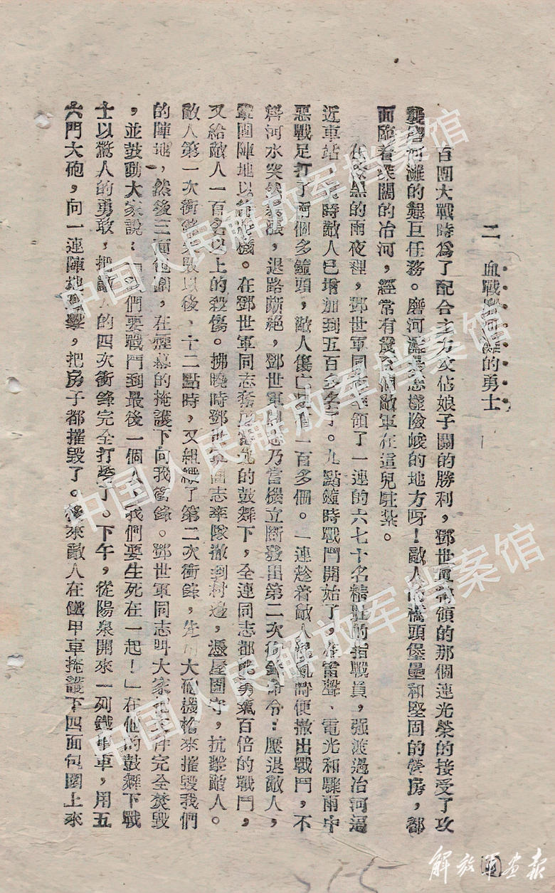 1944年華北軍區(qū)《英雄故事》中記載:鄧仕鈞率領(lǐng)六七十名精壯指戰(zhàn)員,強(qiáng)渡冶河逼近車站。21時戰(zhàn)斗開始,鬼子在睡夢中被驚醒,倉皇應(yīng)戰(zhàn),被我軍一次猛攻就傷亡了幾十人。有一股敵人仗著優(yōu)勢火器向我瘋狂反撲。戰(zhàn)斗持續(xù)2個多小時,敵人傷亡100多人。1連趁敵人混亂之機(jī)準(zhǔn)備撤出戰(zhàn)斗,但此時河水暴漲,歸路斷絕,我軍進(jìn)退兩難。鄧仕鈞沉著冷靜,迅速下達(dá)堅(jiān)決打退敵人、鞏固陣地、等待時機(jī)的命令。拂曉時,他率隊(duì)撤到村邊,憑屋固守,抗擊敵人,又殺傷敵人100多人。中午時分,敵人組織第二次進(jìn)攻,先瘋狂炮轟、機(jī)槍掃射1連陣地,然后從東、西、南三個方向,在煙幕掩護(hù)下突襲進(jìn)攻,壓縮1連防守空間。全連背水一戰(zhàn),將敵人擋在外圍,使其無法靠近娘子關(guān)主陣地。