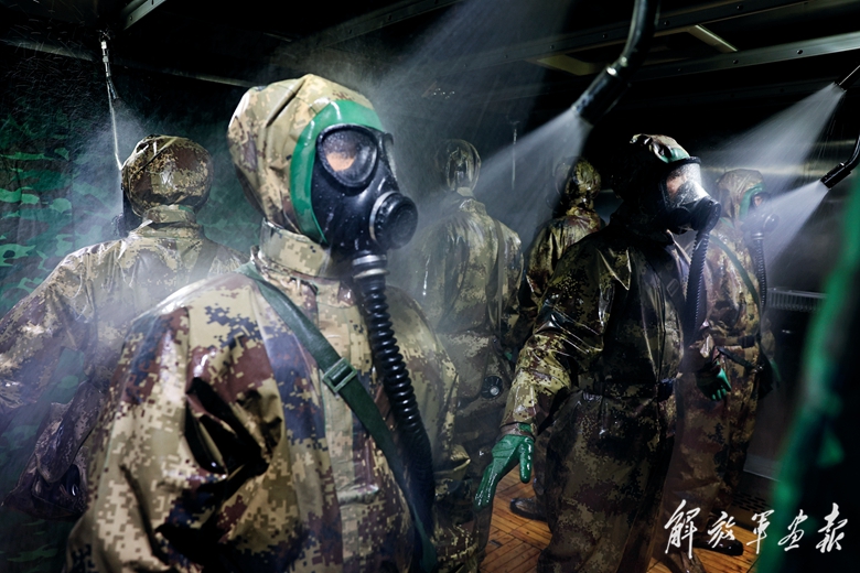 訓練現(xiàn)場濃煙滾滾,兩名官兵穿戴重型防化服,手持檢測裝設備對核心受染區(qū)進行重點偵檢,確定化學成分后迅速撤離并上報指揮組。與此同時,救護組火速將“傷員”轉移至安全地域。受染區(qū)外,洗消組以最快速度搭建好臨時洗消區(qū)域,對離開沾染區(qū)的作業(yè)人員、裝備器材進行全面洗消,確保徹底消除可能附著的化學危險品……