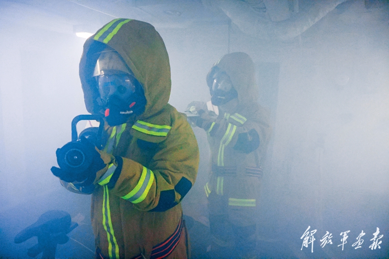 官兵進行艦艇艙內(nèi)損害管制訓練。