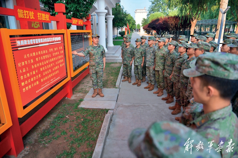 陸軍第82集團軍某旅官兵利用宣傳欄學習中央軍委政治工作會議精神。(攝影/羅 坤)
