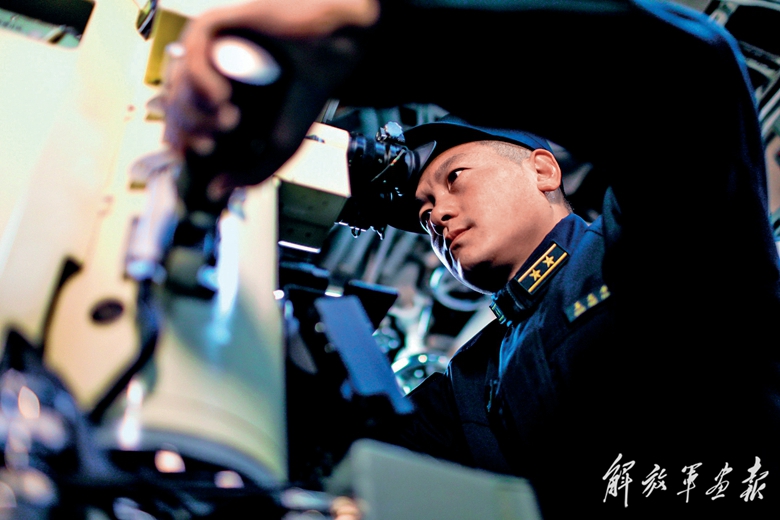 2022年4月,海軍某潛艇支隊(duì)指揮員觀察海上目標(biāo)態(tài)勢(shì)。(攝影/王 青)