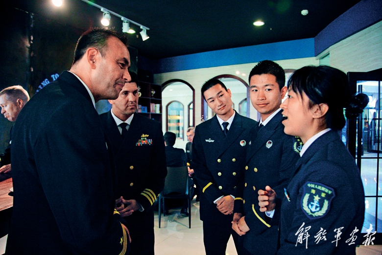 2015年10月,海軍潛艇學(xué)院學(xué)員與到訪的美國(guó)海軍艦艇長(zhǎng)代表團(tuán)成員交流。(攝影/高 密 資料圖片)