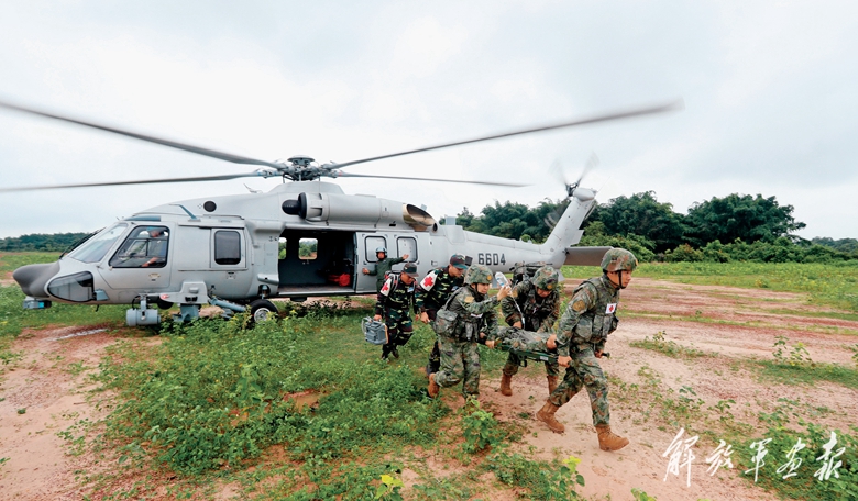 雙方衛(wèi)勤保障人員聯(lián)合進(jìn)行傷員轉(zhuǎn)運(yùn)訓(xùn)練。