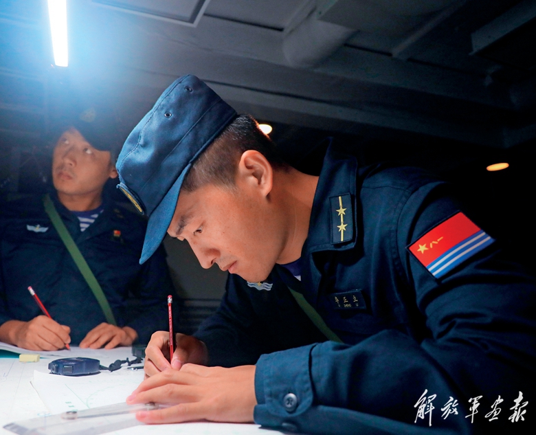作戰(zhàn)室內(nèi),官兵進行海圖作業(yè)。