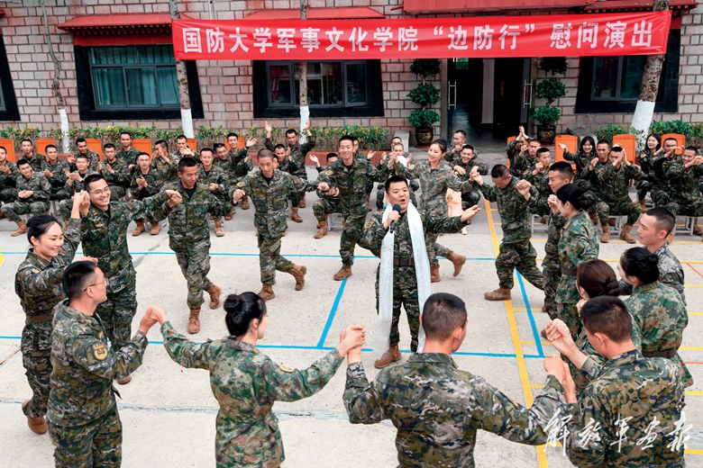 伴著優(yōu)美歌聲,“邊防行”教學(xué)小分隊(duì)學(xué)員與官兵一起舞蹈。
