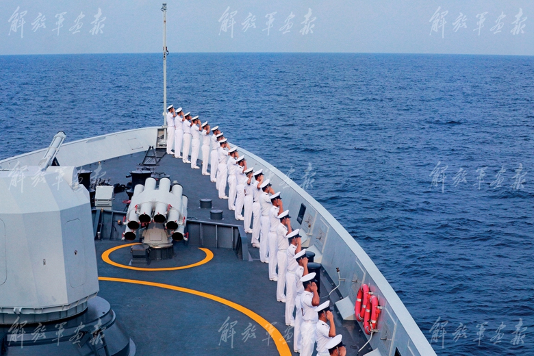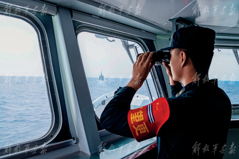我方艦艇官兵觀察海面情況。