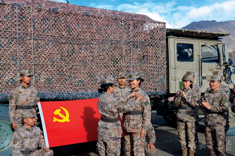 在駐訓(xùn)地為戰(zhàn)士舉行入黨儀式,為新黨員佩戴黨員徽章。