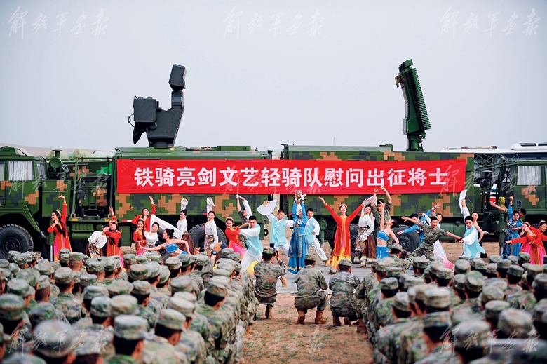 文藝輕騎隊(duì)隊(duì)員為官兵演出精彩的舞蹈。