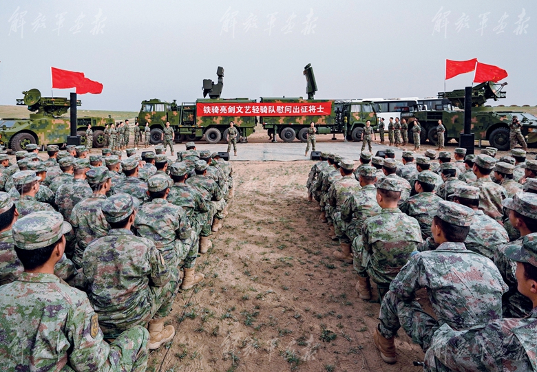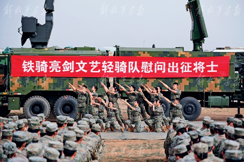 把舞臺搭在演訓(xùn)場,把歌聲送到最前線。伴隨著激昂的音樂,文藝輕騎隊(duì)?wèi)?zhàn)地慰問演出在開場舞《青春戰(zhàn)歌》中拉開帷幕,瞬間點(diǎn)燃全場。沒有炫彩的燈光,但有官兵熱烈的目光;沒有華麗的舞美,卻有戰(zhàn)味十足的真實(shí)背景??犊ぐ旱暮铣?、幽默詼諧的小品、剛?cè)岵?jì)的舞蹈……兵寫兵、兵演兵、兵唱兵,隊(duì)員們創(chuàng)作演出接地氣、冒熱氣的精彩作品,獲得官兵強(qiáng)烈共鳴,為高強(qiáng)度、快節(jié)奏的駐訓(xùn)生活增加許多色彩,有力提振了部隊(duì)士氣,激發(fā)了官兵練兵備戰(zhàn)的熱情。