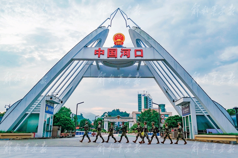 國(guó)慶節(jié)期間,陸軍某邊防旅“紅河前哨鋼二連”官兵在邊檢口岸巡邏。(攝影/曹繼可)