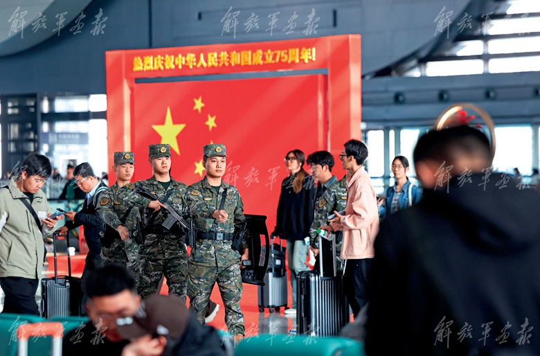 10月1日,武警陜西總隊(duì)漢中支隊(duì)官兵在火車(chē)站執(zhí)勤。(攝影/曹澤鋮)