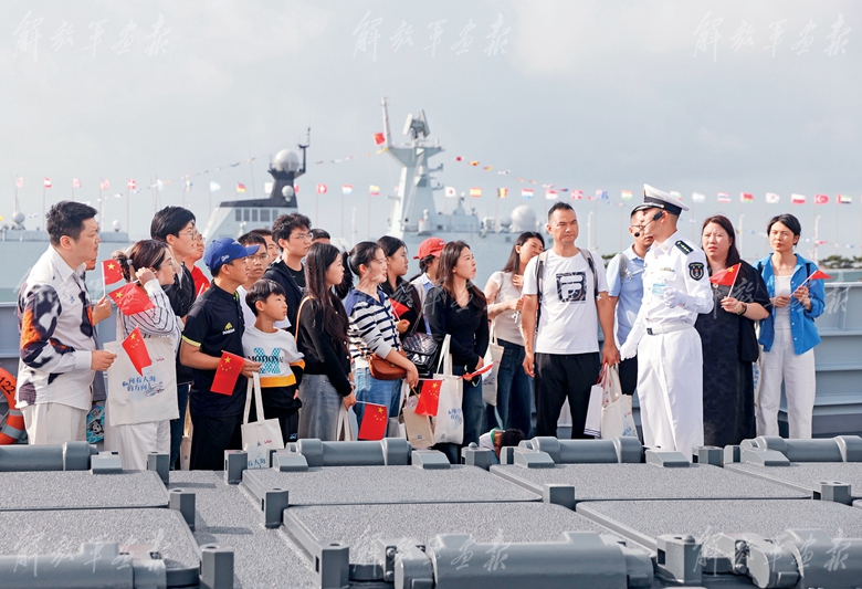 10月1日,北部戰(zhàn)區(qū)海軍舉行艦艇開(kāi)放日活動(dòng)。圖為海軍軍官向參觀艦艇的群眾介紹武器裝備。(攝影/劉再耀)