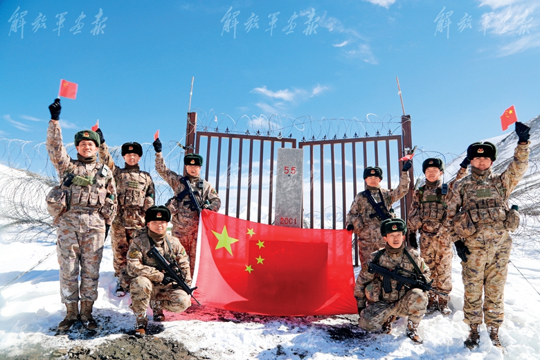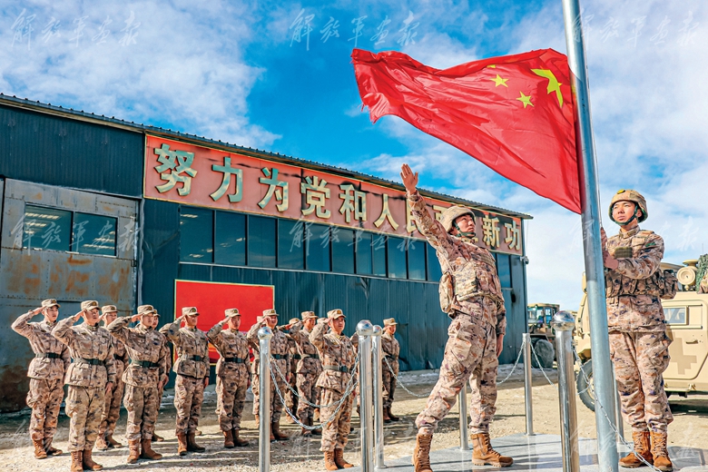 西藏軍區(qū)某邊防團(tuán)“高原戍邊模范營(yíng)”5592觀察哨官兵舉行升國(guó)旗儀式 。(攝影/劉煜欽)