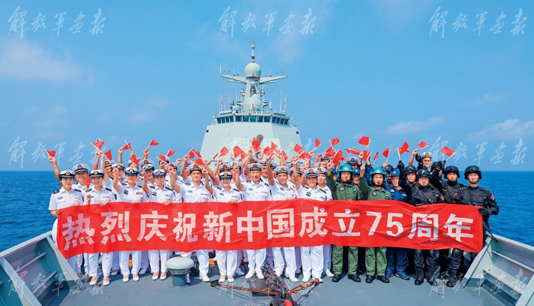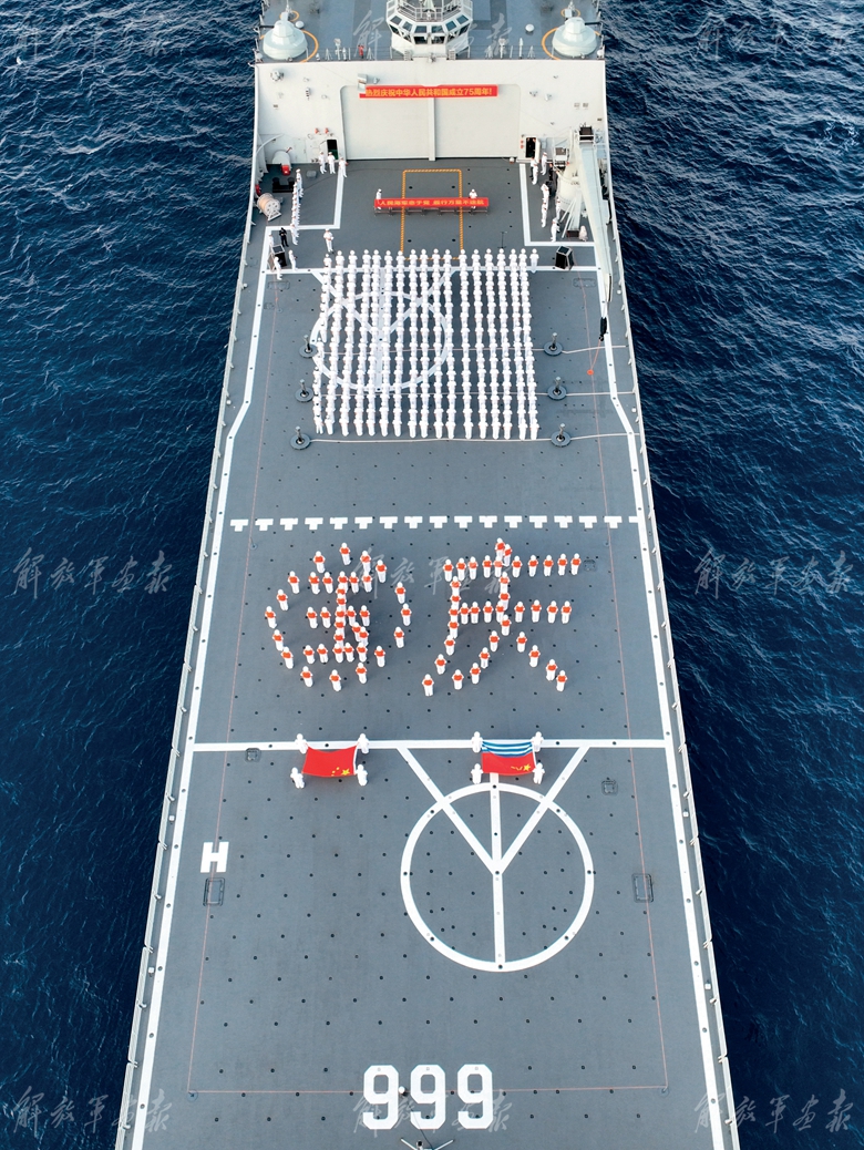 海軍第46批護(hù)航編隊(duì)官兵在任務(wù)途中舉行慶祝儀式,為偉大祖國(guó)獻(xiàn)上祝福。(攝影/張大禹)