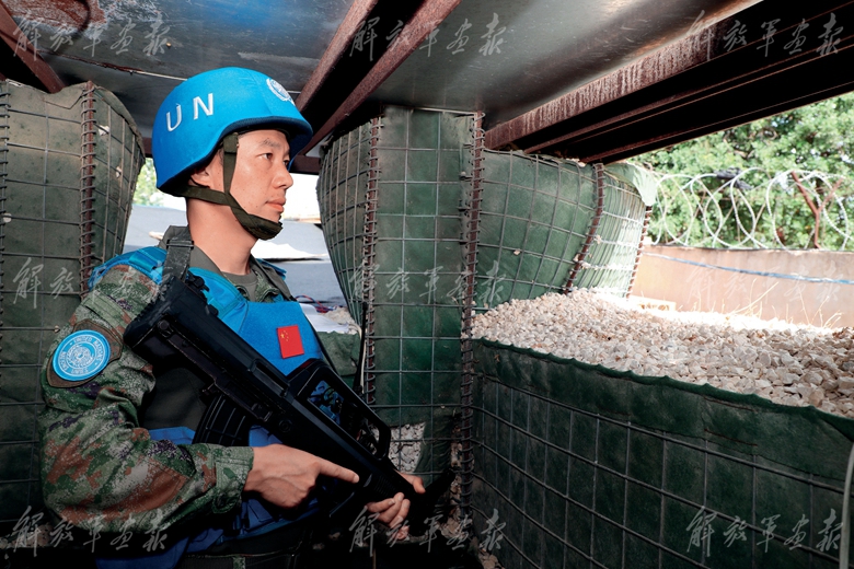 10月1日,中國(guó)第22批赴黎維和部隊(duì)多功能工兵分隊(duì)一號(hào)觀察哨內(nèi),哨兵堅(jiān)守戰(zhàn)位。(攝影/黃遠(yuǎn)利)