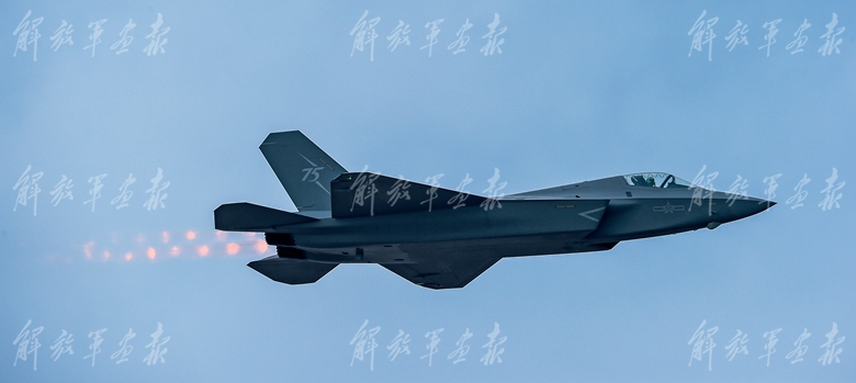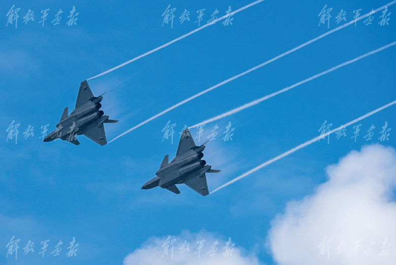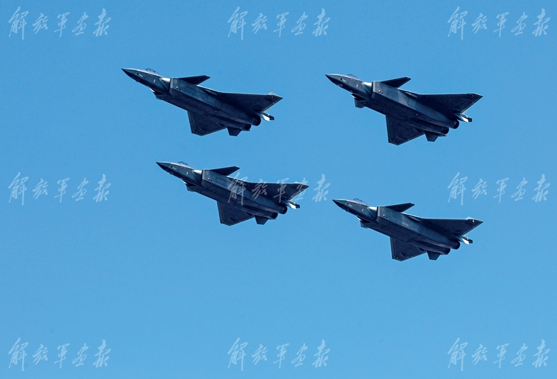 空軍殲-20戰(zhàn)機四機編隊飛行展示。