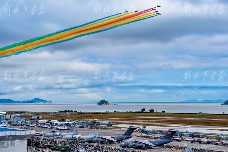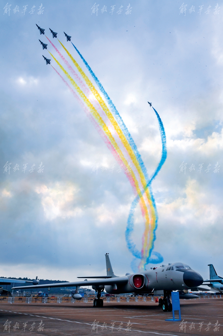 空軍八一飛行表演隊在航展現(xiàn)場上空進行飛行表演。
