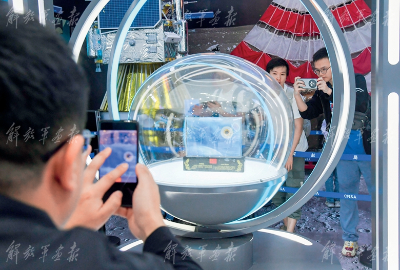 嫦娥六號任務(wù)取回的月球背面月壤樣品首次在“中國航天”展臺向國內(nèi)公眾展出。