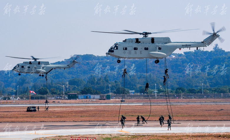 海軍陸戰(zhàn)隊進行空降突擊課目展示。