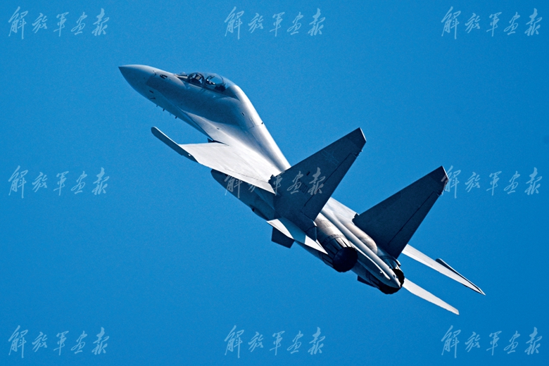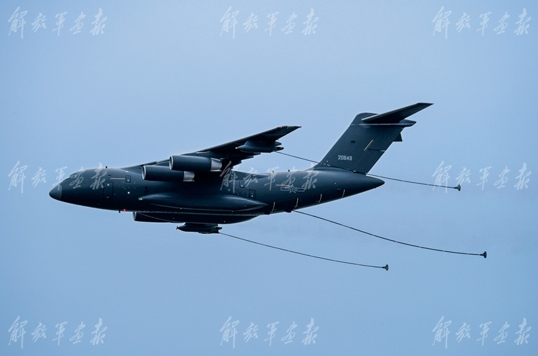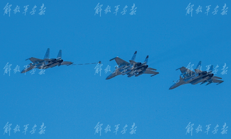 海軍殲-15系列艦載戰(zhàn)斗機編隊展示伙伴加油課目。