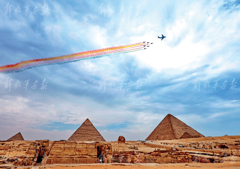 中午時(shí)分,受邀參加首屆埃及航展的人民空軍運(yùn)-20與殲-10表演機(jī)編隊(duì)呼嘯而來,飛越金字塔上空,拉出象征中埃兩國國旗顏色的6道彩煙,與金字塔歷史性“同框”。