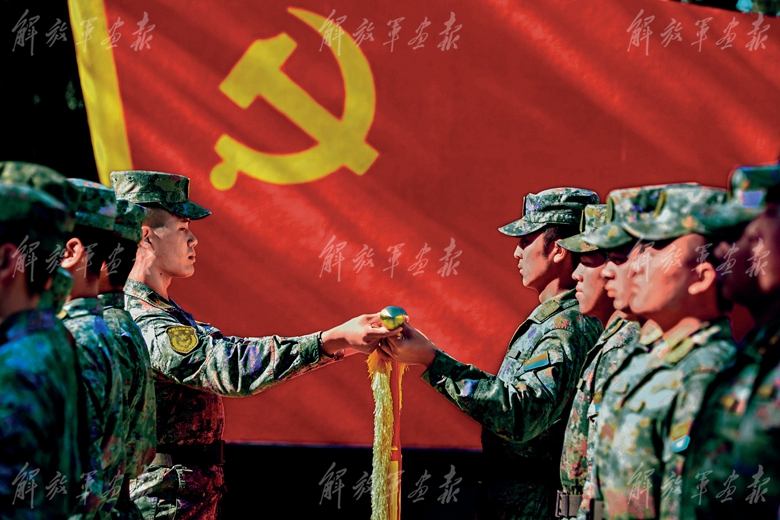 空軍航空兵某團(tuán)飛行二大隊(duì)官兵向黨旗宣誓,立志忠誠于黨、奮斗強(qiáng)軍。(攝影/余紅春)