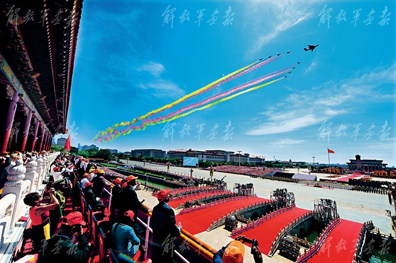2015年9月3日,慶祝中國人民抗日戰(zhàn)爭(zhēng)暨世界反法西斯戰(zhàn)爭(zhēng)勝利70周年閱兵現(xiàn)場(chǎng),空軍八一飛行表演隊(duì)飛過天安門廣場(chǎng)上空,接受檢閱。(攝影/王衛(wèi)東)