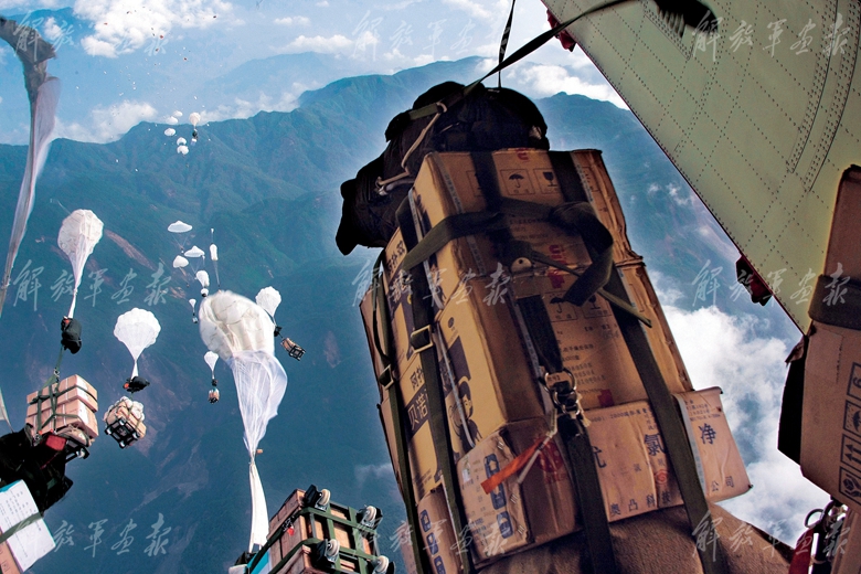 2008年5月,汶川特大地震發(fā)生后,空軍航空兵某運(yùn)輸搜救團(tuán)向震區(qū)投送救災(zāi)物資。(攝影/譚 超)