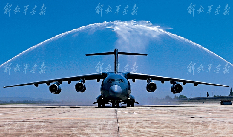 2016年7月6日,空軍隆重舉行運(yùn)-20飛機(jī)授裝接裝儀式。圖為交付的首架運(yùn)-20飛機(jī)滑過“水門”。(攝影/劉 暢)
