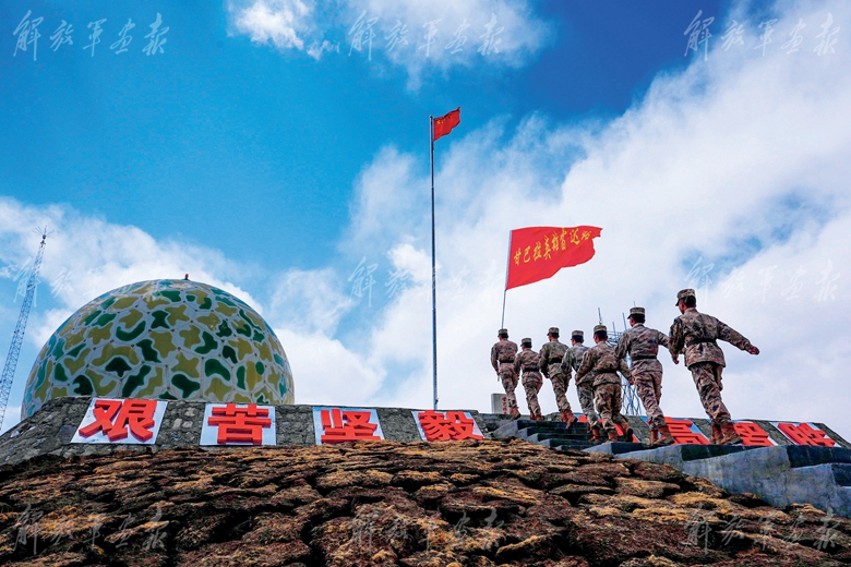 “甘巴拉英雄雷達(dá)站”官兵高擎旗幟走上陣地,開展系列儀式教育。(攝影/馬 冰)