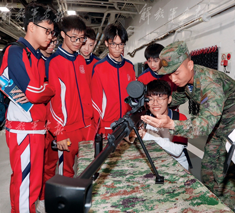 11月22日,海南艦在香港舉行艦艇開放活動,上艦參觀的學生在海軍戰(zhàn)士的指導下體驗武器裝備。(攝影/易 定)