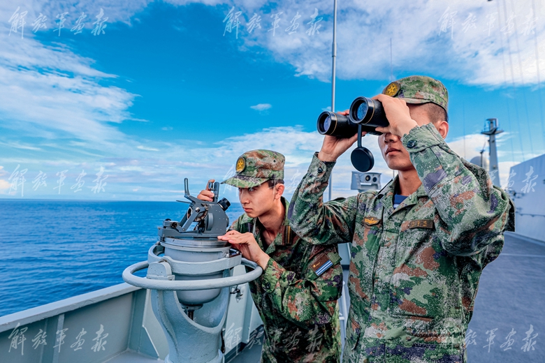 5月10日,海軍83艦編隊(duì)起航執(zhí)行遠(yuǎn)海實(shí)習(xí)和訪問(wèn)任務(wù)。這是6月4日,戚繼光艦航行途中,參訓(xùn)學(xué)員觀測(cè)目標(biāo)方位。(攝影/徐夢(mèng)函)