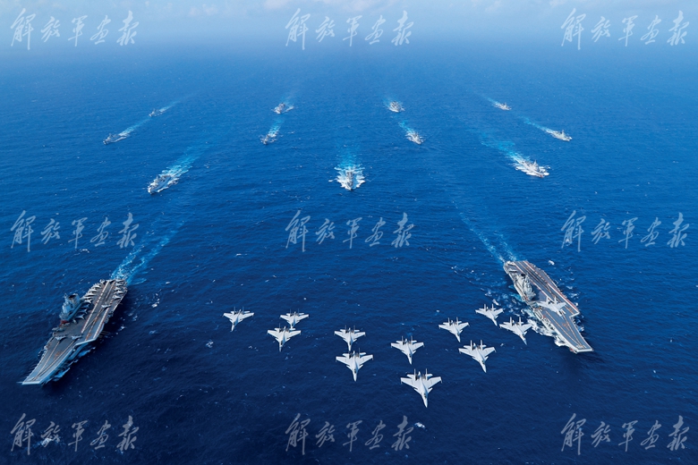 在南海某海域,遼寧艦、山東艦編隊(duì)首次開(kāi)展雙航母編隊(duì)演練,錘煉提升航母編隊(duì)體系作戰(zhàn)能力。(攝影/陳夢(mèng)曦)