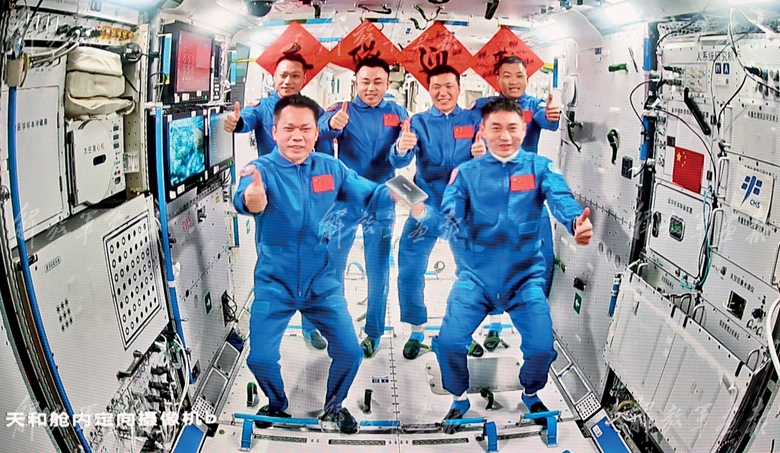 4月26日,在北京航天飛行控制中心拍攝的神舟十七號(hào)航天員乘組和神舟十八號(hào)航天員乘組“全家?!?。(攝影/新華社記者 金良快)