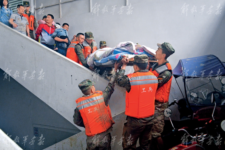 4月,強(qiáng)降雨導(dǎo)致廣東省多地受災(zāi),南部戰(zhàn)區(qū)組織官兵展開(kāi)緊急救援。圖為4月21日,火箭軍某部官兵轉(zhuǎn)移受災(zāi)群眾。(攝影/張 峰)