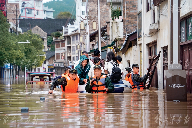 入夏以來(lái),多地發(fā)生洪澇和地質(zhì)災(zāi)害,人民子弟兵和民兵奮戰(zhàn)在防汛救災(zāi)一線,在風(fēng)雨中筑起鋼鐵堤壩。圖為6月28日,武警貴州總隊(duì)官兵在黔東南苗族侗族自治州鎮(zhèn)遠(yuǎn)縣解救被困群眾。(攝影/劉煜鵬)