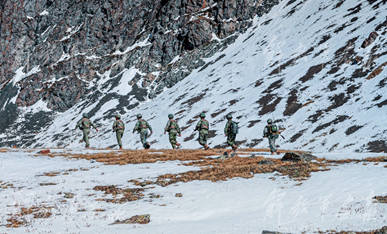 2024年除夕,陸軍某旅三角山邊防連官兵在哨所站崗執(zhí)勤。(攝影/張少為)