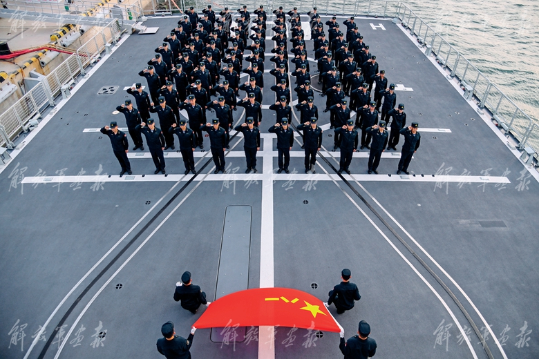 海軍南昌艦黨委聚焦黨在新時(shí)代的強(qiáng)軍目標(biāo),帶領(lǐng)全艦官兵傳承英雄薪火、樹(shù)立“首艦標(biāo)準(zhǔn)”,不斷提升打仗本領(lǐng),用勇?lián)姑男袆?dòng)詮釋錚錚誓言。 圖為南昌艦官兵舉行向軍旗宣誓儀式。(攝影/記者 欒 鋮)