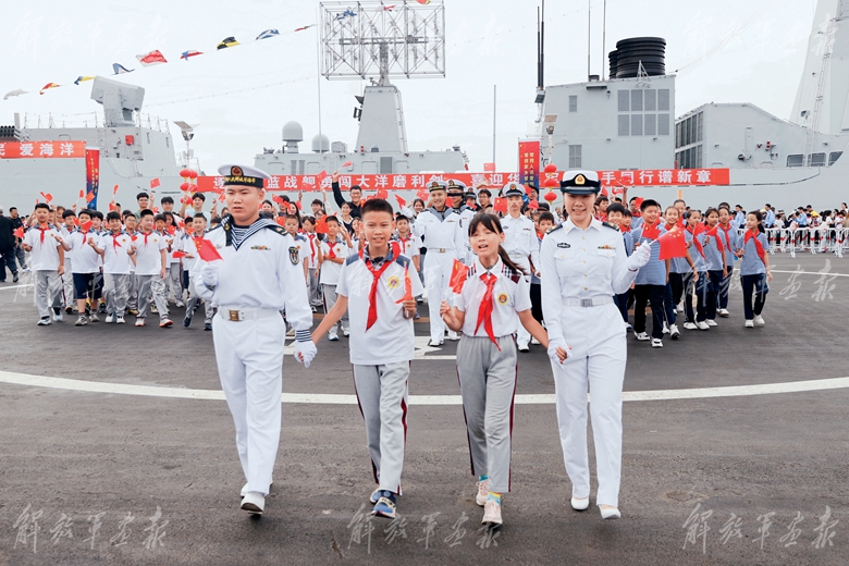 10月1日至3日,北部戰(zhàn)區(qū)海軍在青島3號(hào)碼頭和青島奧帆中心碼頭舉辦艦艇開(kāi)放活動(dòng),慶祝新中國(guó)成立75周年。圖為艦艇官兵和學(xué)生齊聲高唱《歌唱祖國(guó)》。(攝影/劉再耀)