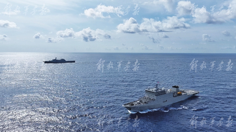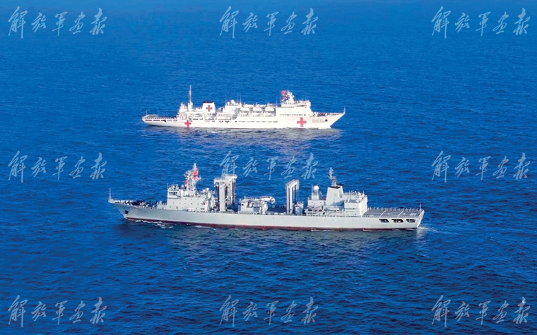 當(dāng)?shù)貢r(shí)間12月15日7時(shí)許,執(zhí)行“和諧使命-2024”任務(wù)的中國(guó)海軍和平方舟醫(yī)院船在向斯里蘭卡航渡期間,航經(jīng)亞丁灣某海域,與正在此機(jī)動(dòng)巡航的海軍第46批護(hù)航編隊(duì)相遇。(攝影/鄔興羽)