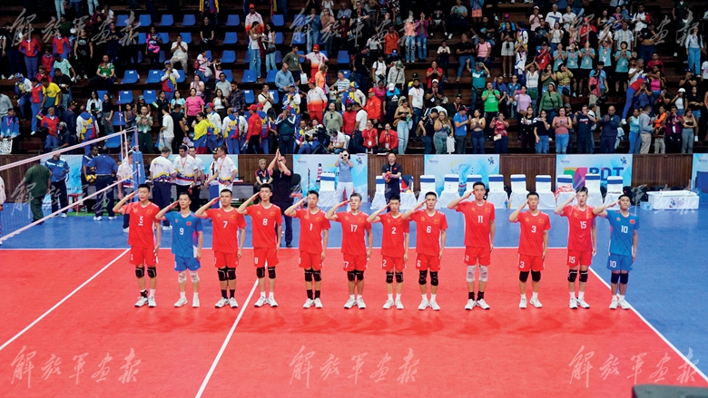 當(dāng)?shù)貢r(shí)間8月17日至23日,第四屆世界軍校學(xué)員運(yùn)動(dòng)會(huì)在委內(nèi)瑞拉首都加拉加斯蒂烏納堡軍事基地舉行。圖為我軍體育代表團(tuán)男子排球隊(duì)賽后向全場(chǎng)行軍禮。(攝影/記者 宋 逸)