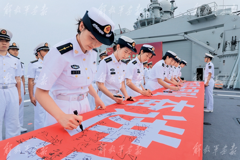 7月25日,海軍首批艦載機(jī)女飛行學(xué)員執(zhí)行遠(yuǎn)航實(shí)習(xí)訪問(wèn)任務(wù),正值甲午海戰(zhàn)130周年,女飛行學(xué)員開(kāi)展宣誓簽名活動(dòng)。(攝影/鐘迪倩)