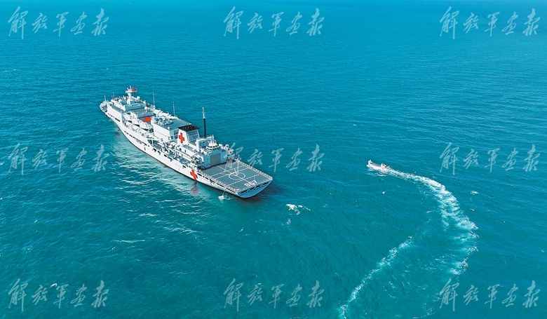 7月10日,“絲路方舟”號(hào)醫(yī)院船起航,首次執(zhí)行南海島礁巡診任務(wù),受到島礁官兵的歡迎。圖為接送就診官兵的小艇駛往“絲路方舟”號(hào)醫(yī)院船。(攝影/張之煜)