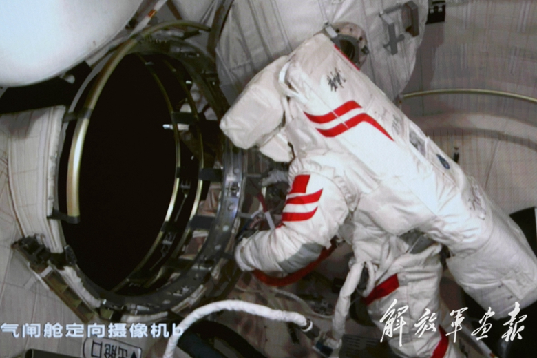 1月20日在北京航天飛行控制中心拍攝的神舟十九號(hào)航天員蔡旭哲在氣閘艙艙門(mén)內(nèi)工作的畫(huà)面。(攝影/新華社記者 劉 芳)