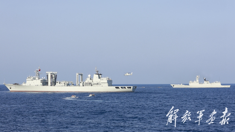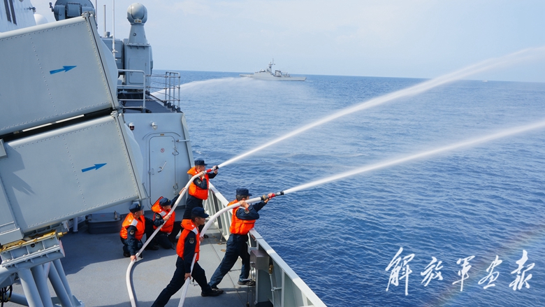 當(dāng)?shù)貢r(shí)間2024年5月30日,中國海軍第46批護(hù)航編隊(duì)許昌艦在指定演習(xí)海域參加區(qū)域海上聯(lián)合演習(xí)。圖為演習(xí)現(xiàn)場。(攝影/張虎志)