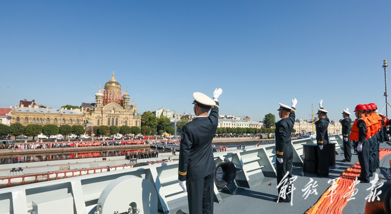 當(dāng)?shù)貢r(shí)間2024年7月23日,中國海軍第46批護(hù)航編隊(duì)靠泊圣彼得堡某碼頭,官兵向碼頭歡迎人群揮手致意。(攝影/張大禹)